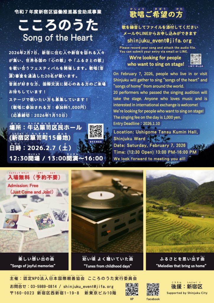 2026年2月7日、新宿に住む人や新宿を訪れる人々が集い、世界各国の「心の歌」や「ふるさとの歌」を歌い合うフェスティバルを開催します。